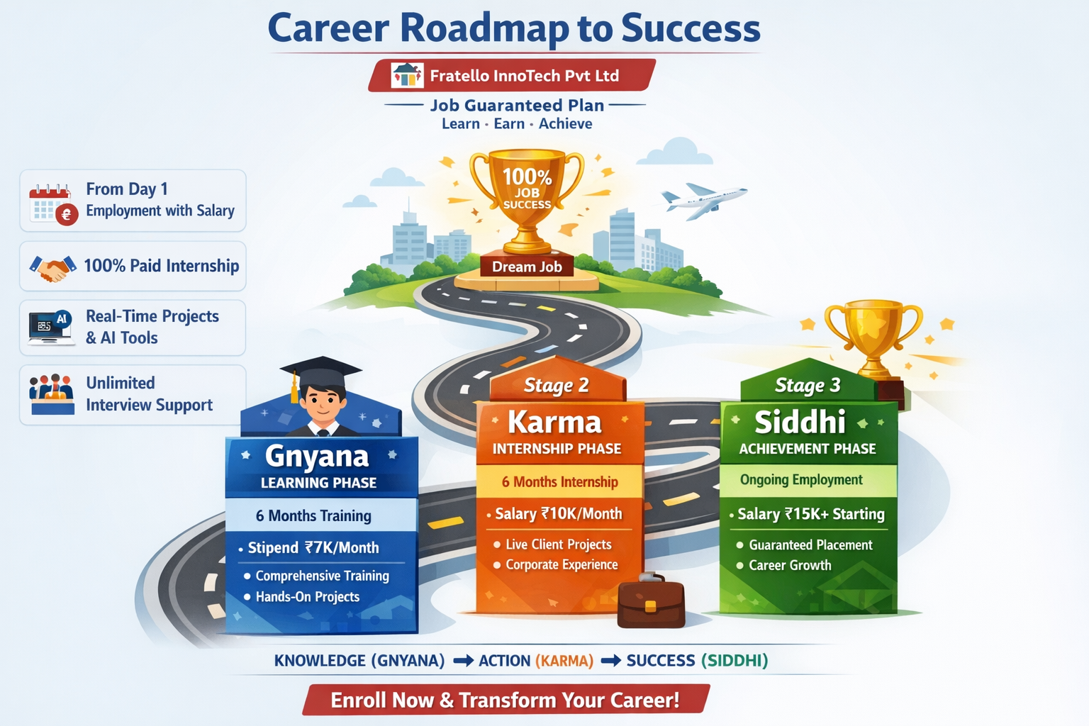 Duration: Ongoing EmploymentSecure a full-time job with our guaranteed placement. Continue to grow in your career with our continuous support. Get assistance in salary negotiation, career planning, and skill upgradation. We support you until you get a better opportunity and help you climb the corporate ladder.